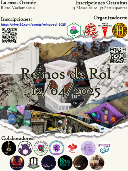 El sábado 12 de abril de 2025 se celebra Reinos Rol 2025 en Rivas-Vaciamadrid, con partidas de rol en mesa para distintos niveles y estilos de juego.